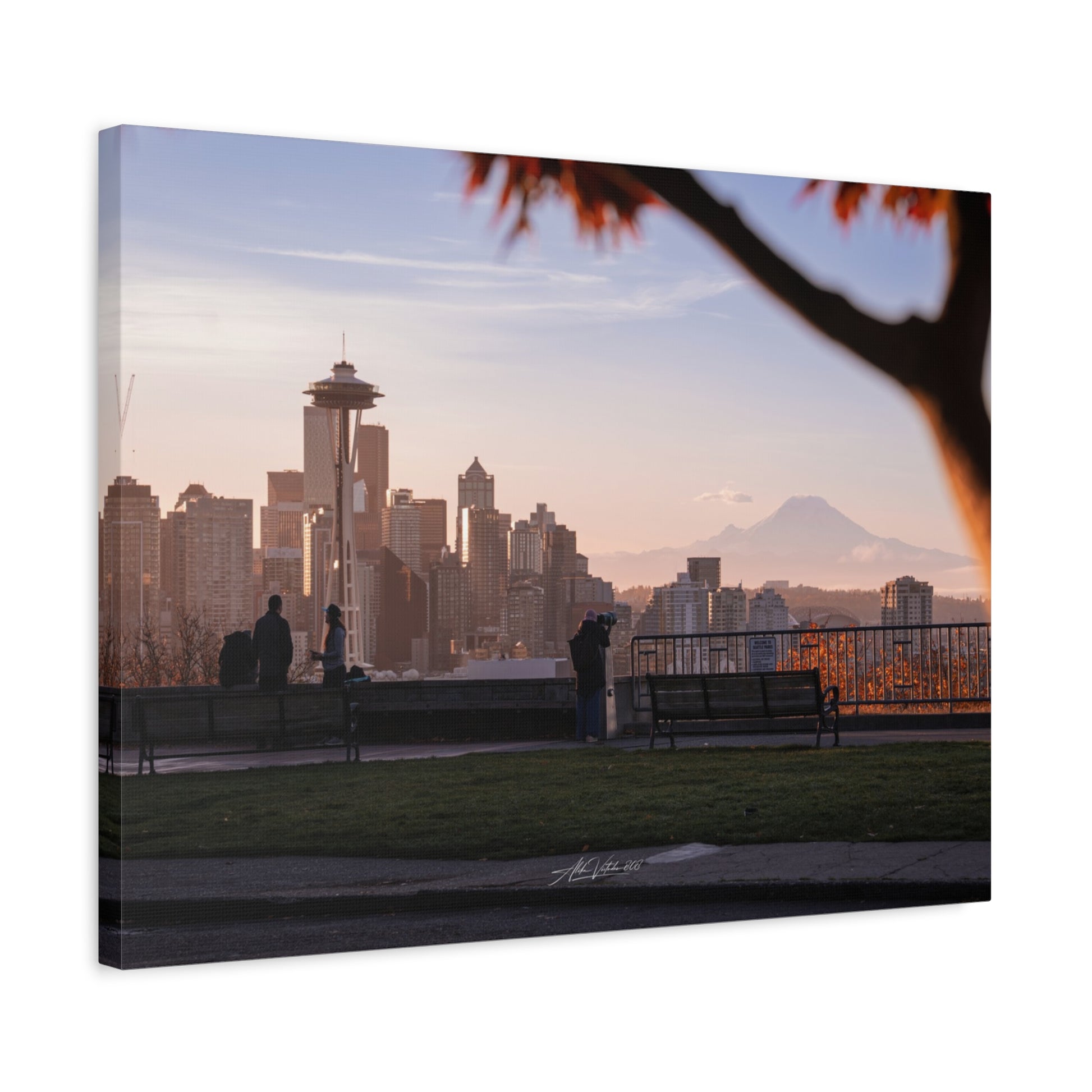 Seattle Cityscape Matte Canvas Print — Kerry Park Fall Golden Glow with Mt. Rainier & Space Needle (Stretched 1.25")