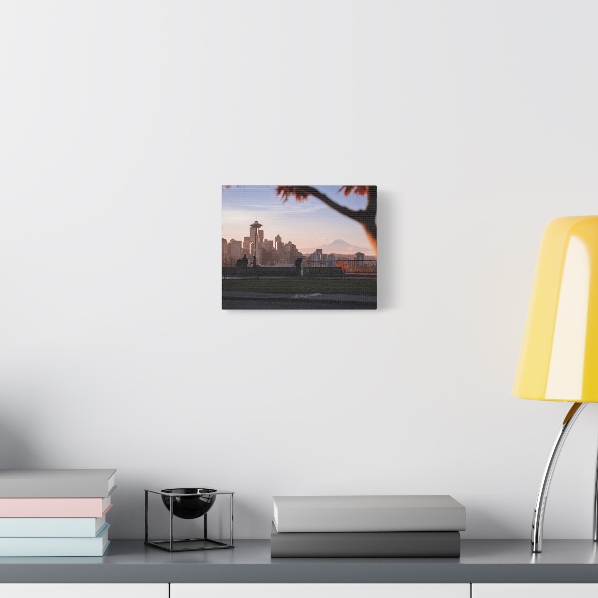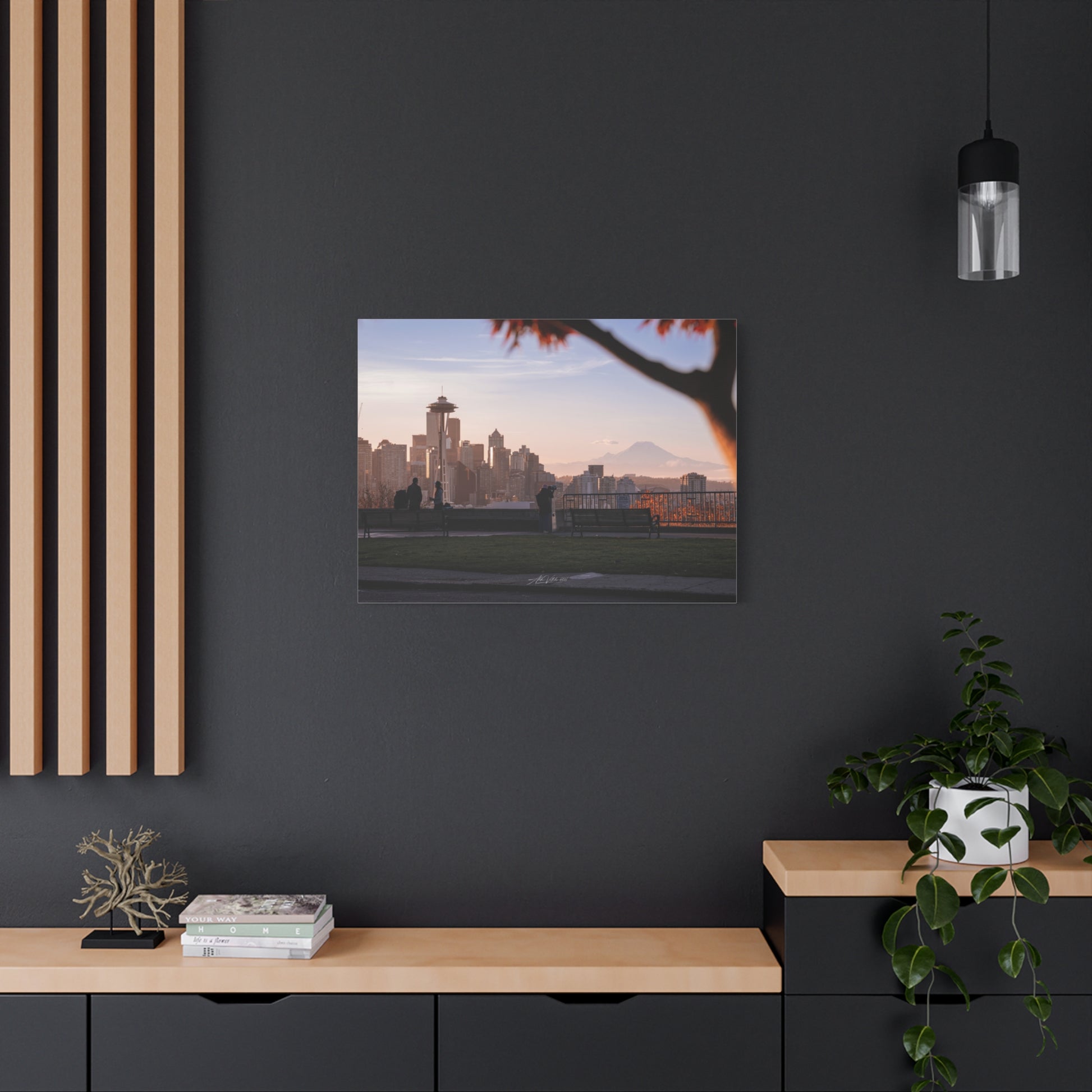 Golden, quiet light spills over Seattle’s skyline as seen from Kerry Park. This stretched matte canvas captures that slow, autumnal moment — the Space Needle balanced against a faint, snow-capped Mt. Rainier and rows of warm rooftops glowing in fall tones. Hang it above a small reading nook or on a living-room gallery wall; it brings the calm, luminous hush of a late-afternoon city stroll into the room. The matte finish softens reflections and deepens color, while the lightly textured canvas keeps the scene feeling handmade and familiar. It’s for people who memorize routes through the city, who collect views instead of things, and who want a piece that reads like a memory rather than a poster.